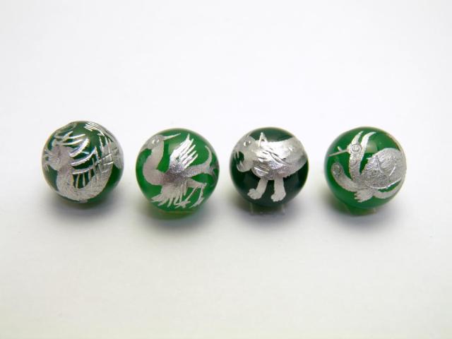 四神獣4点セット グリーンメノウ銀彫り 彫刻ビーズ 12mm玉 青龍・朱雀・白虎・玄武 天然石 パワーストーン