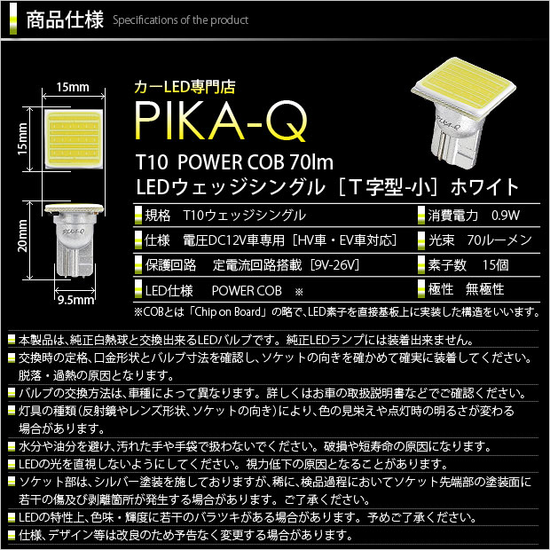COBサイズ:15mm×15mm/COB最大直径:21mm/高さ:20mm/ソケット幅:9.5mm ※T10白熱球サイズ 全長:27mm/最大直径:10mm/幅:9.5mm | |||