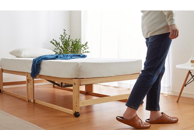 ベッドを広げた時には最下点の木部フレームよりもキャスターの最下点が若干浮くように設計しております。その為、キャスターの跡が畳にクッキリ残ったりすることなく、どのような床面でも傷が付きにくい商品となっております。