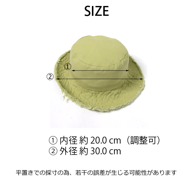今季トレンドのバケットハットの新登場。切りっぱなしのラフさがこなれ感を演出するアイテム。色々なコーデに取り入れやすいシンプルなデザイン♪カラーバリエーションも豊富な6色展開。男女問わずお使い頂けるのも嬉しいポイント◎ご自身はもちろん、ちょっとしたプレゼントにも最適です!商品説明:■サイズ:?@内径 約20.0cm(調整可) ?A外径 約30.0cm■素材:本体:綿■原産国:中国■注意事項 ★平置きでの採寸の為、若干の誤差が生じる可能性があります。★モニター画面により、画像の色味と多少異なる場合がございます。不良品として返品対象になりませんので、ご了承ください。■サイズ詳細は画像に記載■キャンセル・変更不可