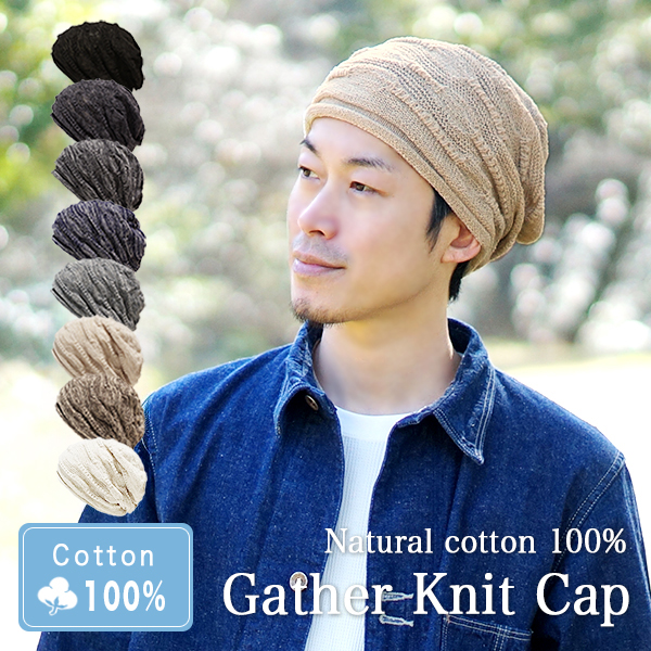 【メンズ ニット帽】 夏用 綿100% 通気性 メール便送料無料 春夏 蒸れない おしゃれ 帽子 男性 ゆったり 春 夏 秋 冬 シンプル 薄手 外出 薄毛 白髪隠し レディース 女性【ナチュラルコットン100%ギャザーニットキャップ】