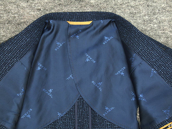 織ネーム(耳ネーム)を左胸内ポケットに、専用のロゴ入りジャガードを裏地に使用しています。