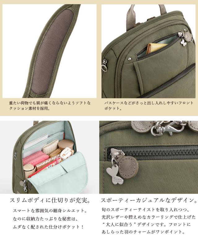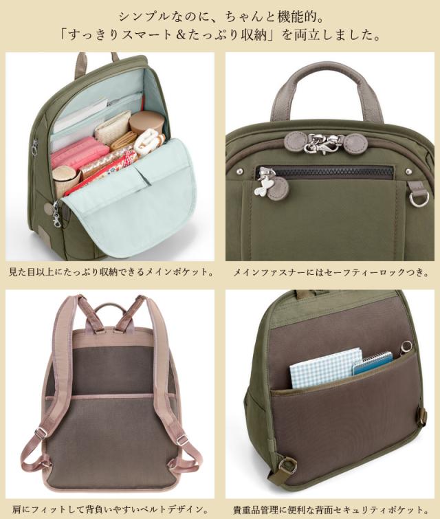 街歩きからちょっとしたレジャーまで対応のバッグです。シャリ感のある素材で、スタイリッシュな印象です。リュック使用時はA4サイズがゆとりを持って入る大きさで、雑誌やファイルも収納可能。メインファスナーは、簡単に開かない様、セキュリティロックが。背面にポケットには貴重品を収納することもでき、自分の目の届かないリュック使用時にうれしい機能も搭載。