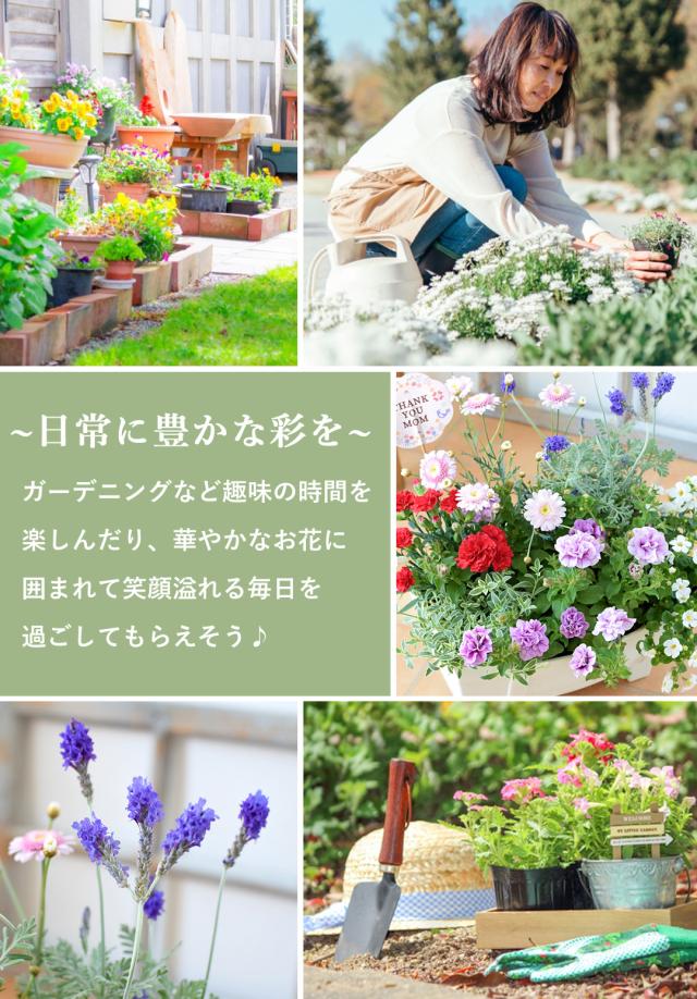 - ガーデニング歴の長い母が「カーネーションはかわいいけれどもなかなか年越しが難しい」と言っていたので、「たくさん種類が入っているほうがいいかも」とこちらの寄植えを選びました。とても喜んでくれて、すてきなお花がたくさん入っていて見ているだけでわくわくすると言ってもらえました!この寄植えの横で母がにっこりしている写真をLINEしてくれましたが、見本の写真と変わらない豪華さでした。こちらを選んで本当によかったです。