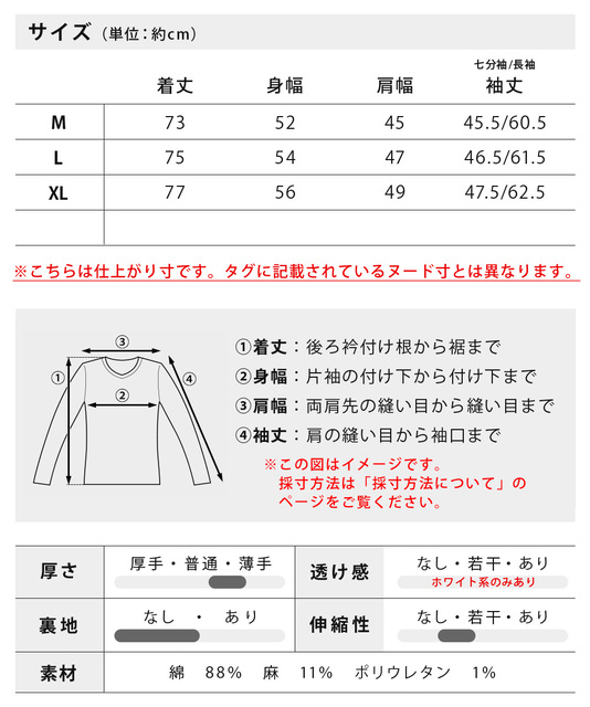 | サイズ | 着丈 | 身幅 | 肩幅 | 袖丈(7分袖/長袖) |