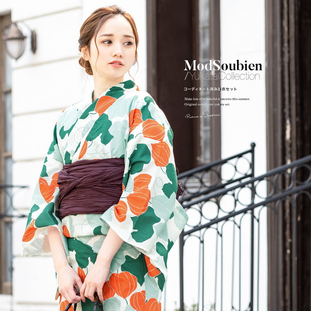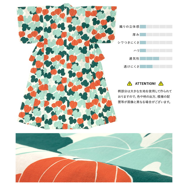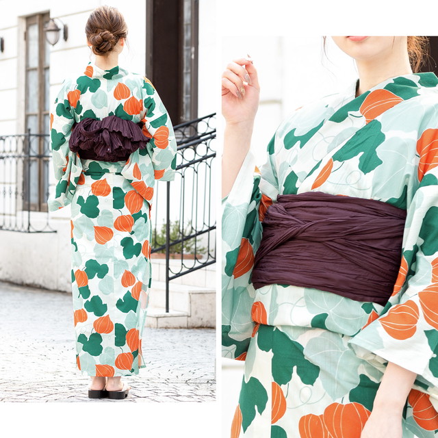 浴衣セット レディース レトロ 浴衣セット 大人 3点セット グリーン 緑 白 橙色 ボルドー 鬼灯 鬼燈 酸漿 ほおずき 植物 綿 夏祭り 花火大会 女性用 S・フリー