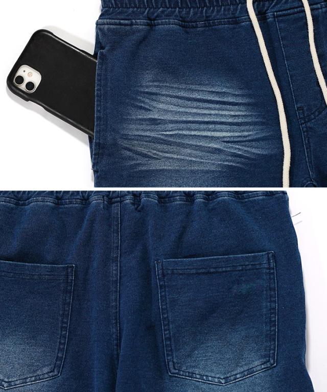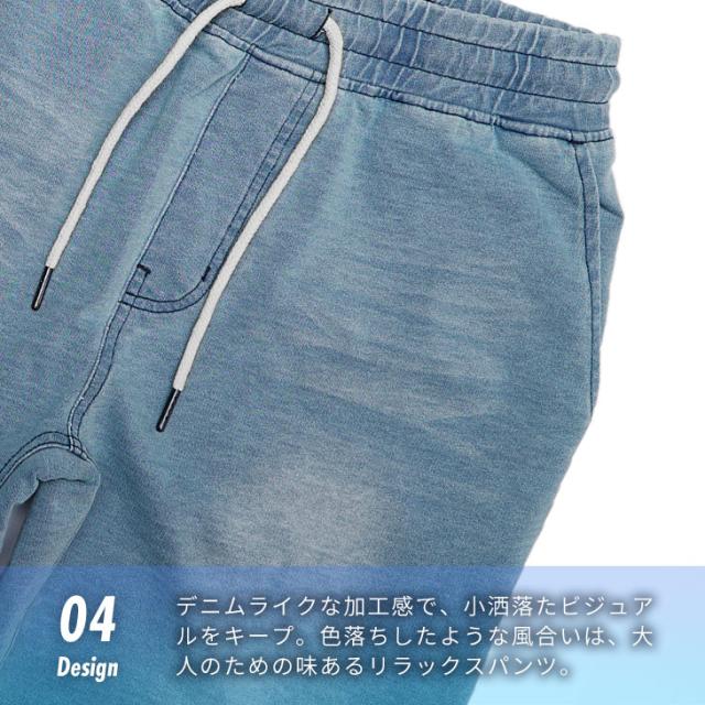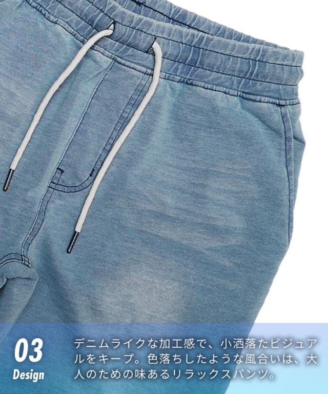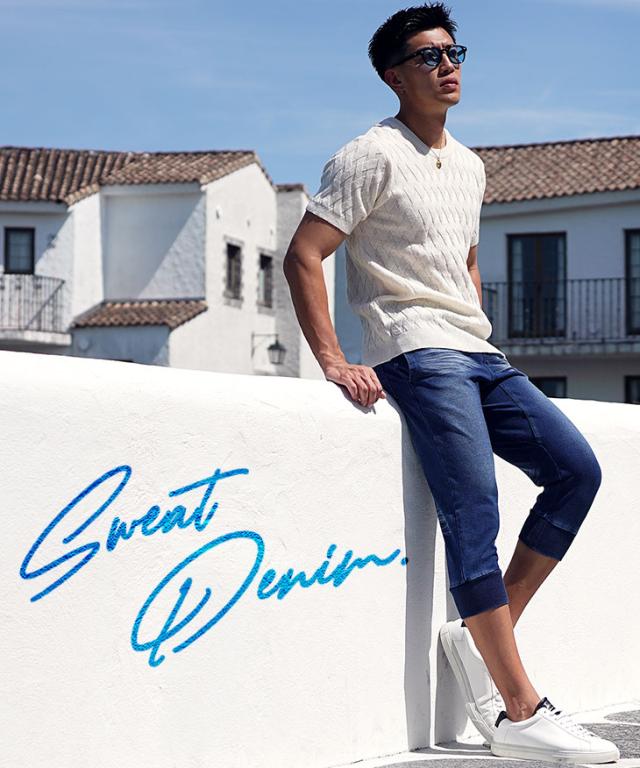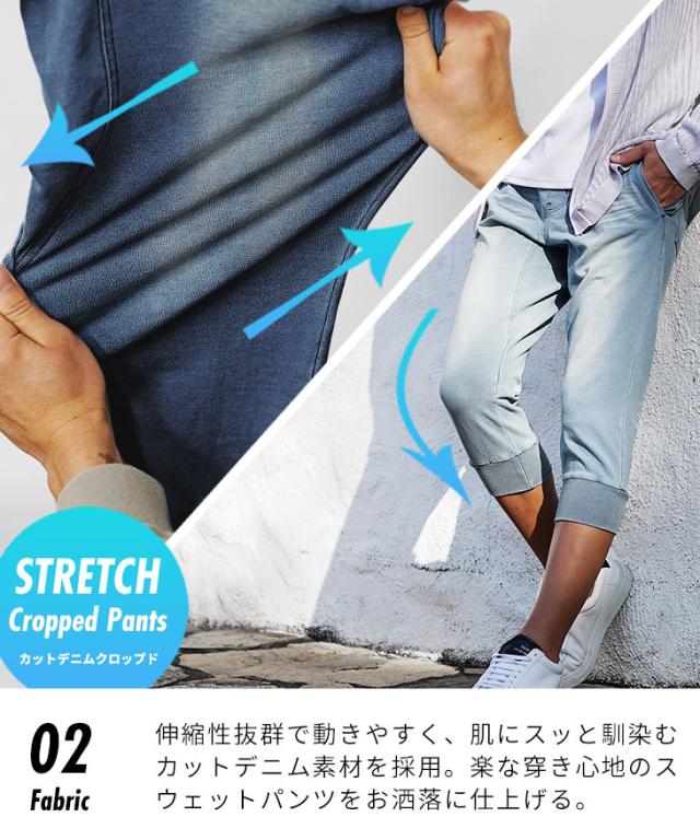 夏の主役パンツ『スウェットデニムクロップドパンツ』スウェットデニムクロップドパンツ【夏を彩るクロップド丈】やや短い丈感となり通年使えるものの特に夏の定番アイテムとして名高いクロップドパンツ。カットデニム素材を使っているので柔らかで爽やかなイメージを作れます。【伸縮性抜群】カットデニム素材は伸縮性抜群で動きやすく、肌にすっと馴染んでくれる履き心地。おしゃれにスウェットを穿きこなしたい、そんな貴方にオススメです。【定番ジョガーパンツ】裾口はリブ仕様で、キュっと足元を引き締めてくれます。足首が見え、足元が協調されるモデルとなるので下半身飲んボリュームを抑え、スタイルアップ効果が期待できます。