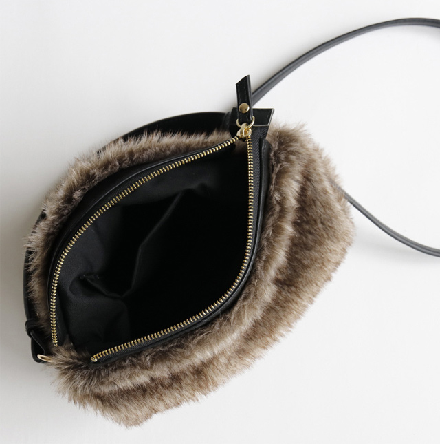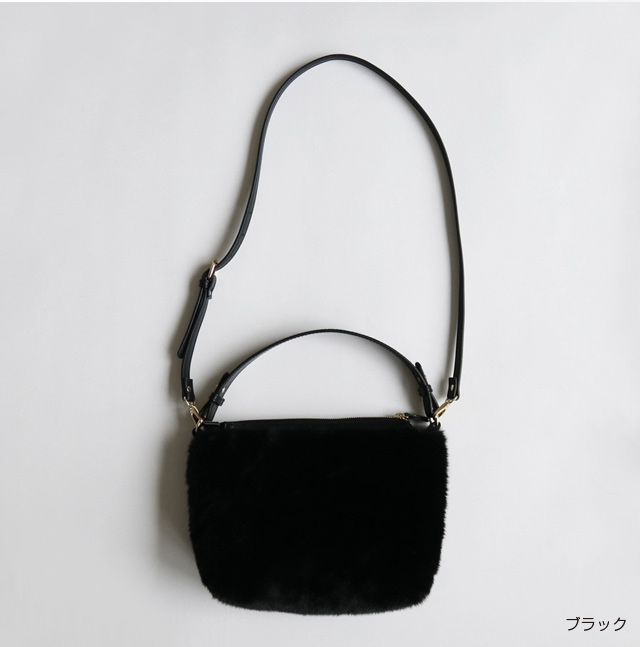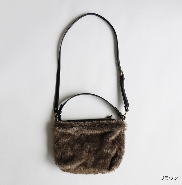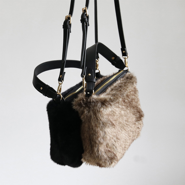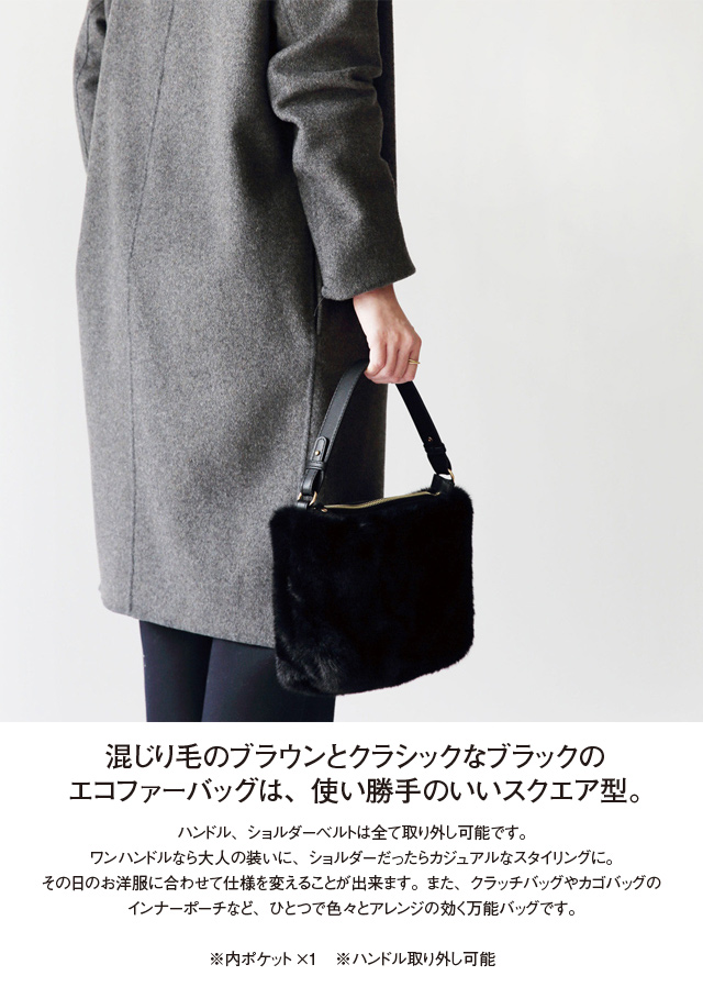 混じり毛のブラウンとクラシックなブラックのエコファーバッグは、使い勝手のいいスクエア型。