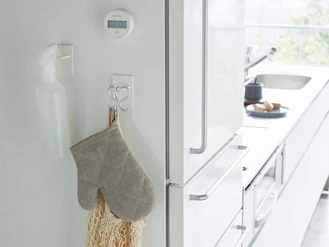 洗濯機にくっつけて掃除用具をまとめたり、冷蔵庫につけてエプロンやエコバックを収納したり、玄関につけて子供の合羽や帽子などをひっかけておいたり。約500gまでのものなら何でも引っ掛けておけます。