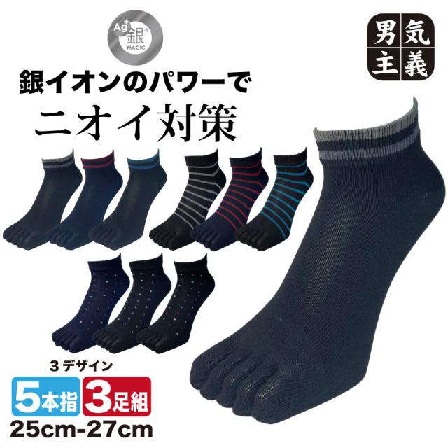 五本指靴下 メンズ おしゃれ 防臭 銀イオン消臭 3足セット スニーカー丈 25cm-27cm 銀マジック 選べるデザイン ビジネス カジュアル