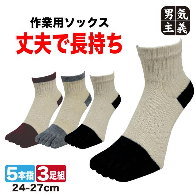 軍足 5本指 メンズ 3足組 富士手袋 ショート丈 五本指軍足 25cm-27cm 綿混 吸汗 丈夫 蒸れない スニーカー丈 くるぶし丈 ワークソックス 紳士 男性 グレー カラーアソート 3足セット