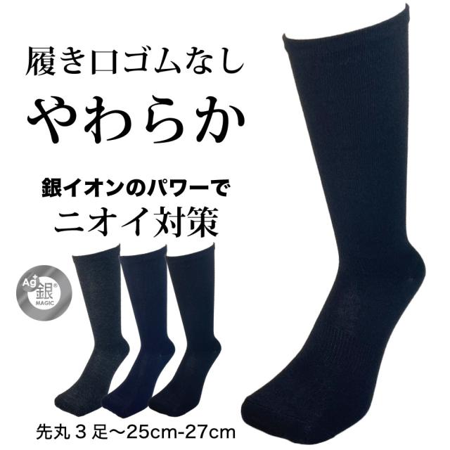 靴下 ゆったり メンズ ビジネスソックス 3足組 先丸 防臭靴下 クルー丈 銀イオン消臭 25cm-27cm 履き口ゆったり 黒 カラー