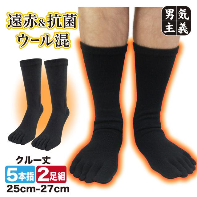 五本指ソックス メンズ 冬用 暖かい 靴下 防寒 ガチ暖 遠赤外線 セラフィ ウール混 2足組 クルー丈 抗菌防臭 蒸れない 極厚すぎない 作業 アウトドア 黒