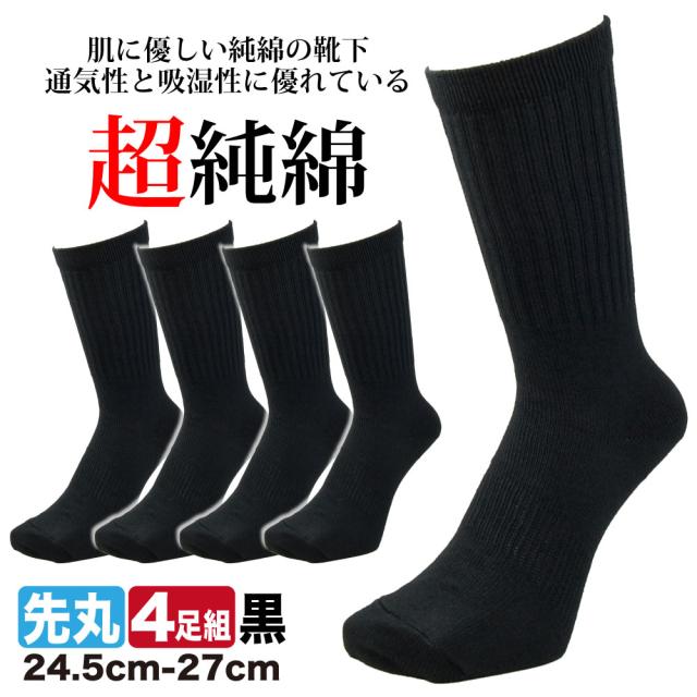 靴下 メンズ 先丸ソックス 4足組 超純綿 綿100% 表糸 軍足 ブラック 黒 丈夫 蒸れない 吸汗 高い通気性 紳士 作業用 ビジネス ズレにくい 25-27cm