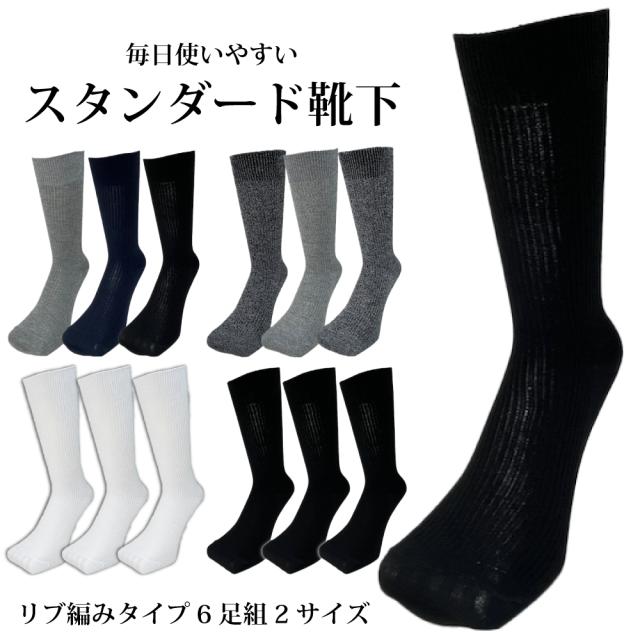 靴下 メンズ ビジネス カジュアル リブソックス クルー丈 6足組 黒 白 カラーアソート 24cm-28cm対応 抗菌防臭 つま先かかと補強