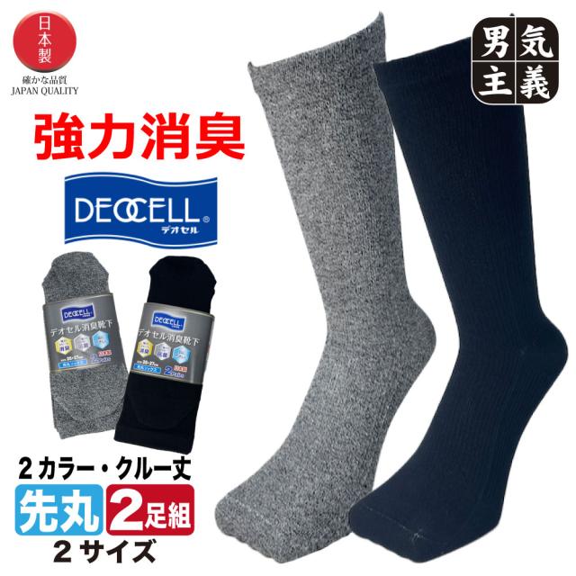 靴下 メンズ 消臭 日本製 デオセル 2足組 25cm-29cm ビジネスソックス クルー丈 強力消臭 抗菌 防臭 蒸れない 紳士 男性 黒 杢グレー 27 28 29 センチ 大きいサイズ 冠婚葬祭 仕事 ギフト