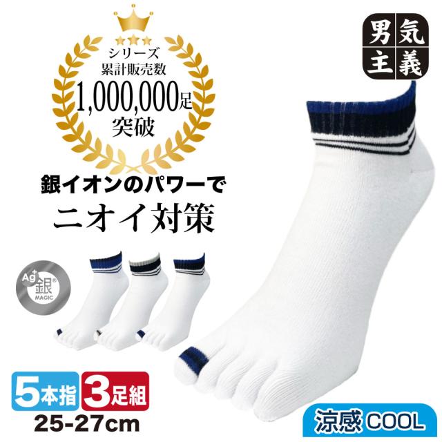 靴下 五本指ソックス メンズ 白 3足組 銀マジック 涼感 スニーカー丈 夏用 25-27cm 抗菌 防臭 消臭 蒸れない 涼しい スポーツ 紳士 綿混 セット ホワイト 818