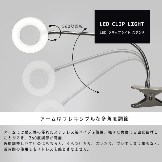 アーム長32cmの長尺アームは様々な角度に自由に曲げることができ、ライト部分も360度調節が可能!