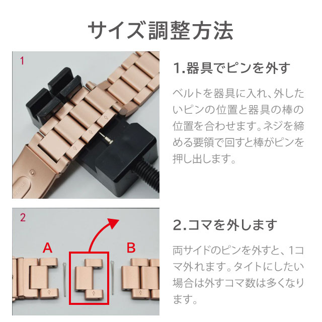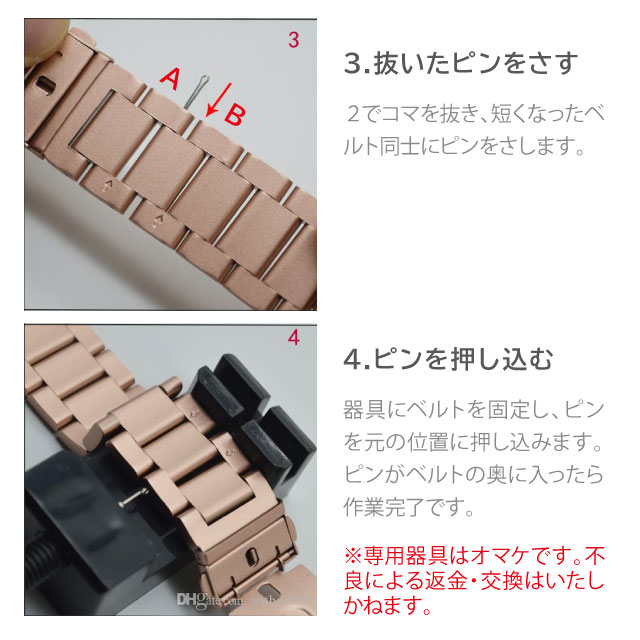 - コマの調整が苦労した。 ピンクゴールドを購入しました。 装着時、スプリングピンが飛んで、行方不明になった。 残念です。