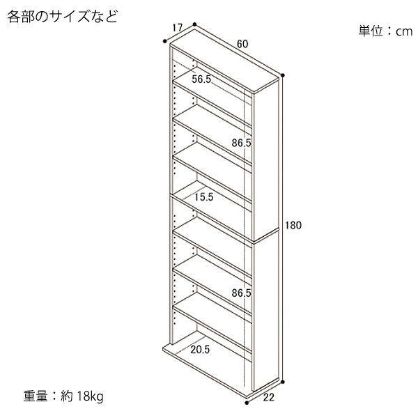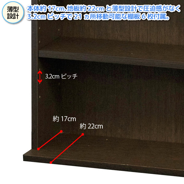 | 説明 | 梱包サイズを小さくするため、側板を分割しています。奥行は本体部分約17cm、地板約22cmと薄型設計ですので、圧迫感がなく、CDやDVD、文庫本などをサイズに合わせて、たっぷり収納できます。 |