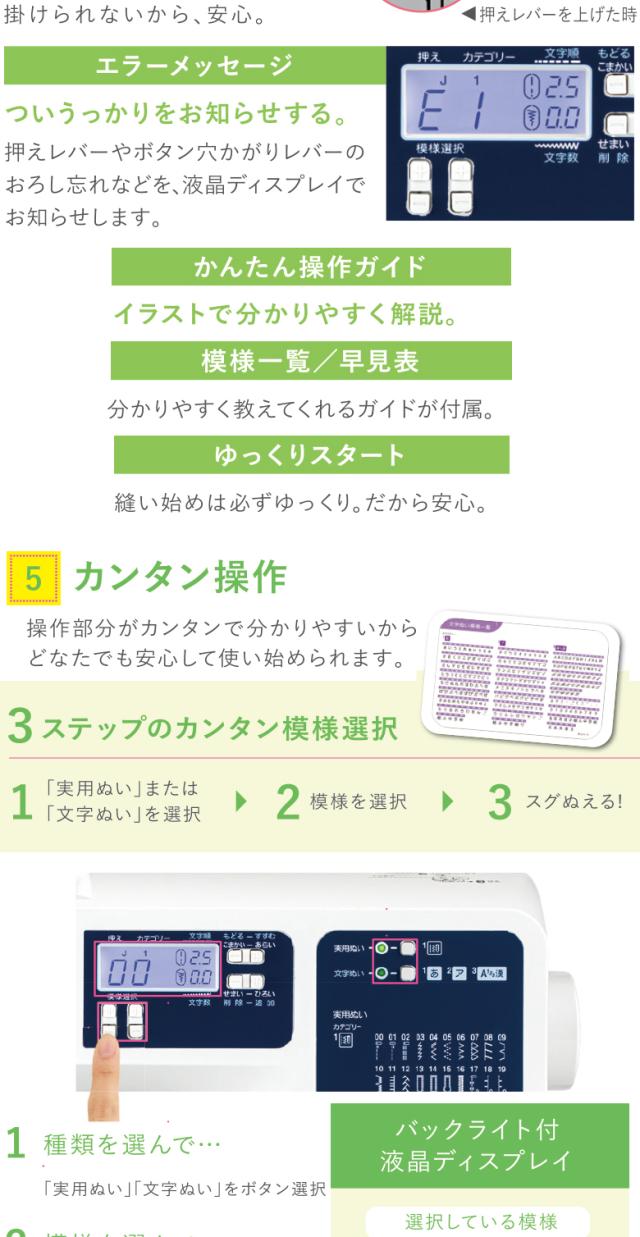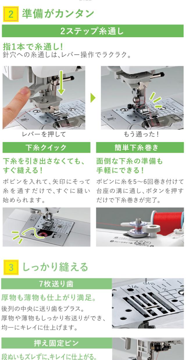 2ステップ糸通し、下糸クイック、簡単下糸巻き、7枚送り歯、押え固定ピン、全自動ボタン穴がかり、LEDライト、ゆっくりぬい、針停止位置切替、一針縫い、天びんシャッター、エラーメッセージ、ゆっくりスタート