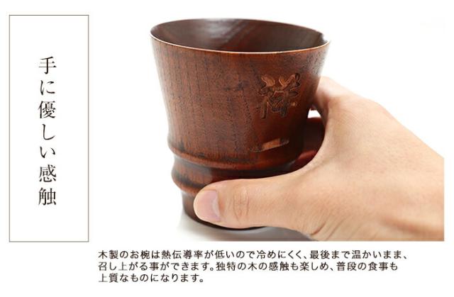 木製のカップは熱伝導率が低いので冷めにくく、最後まで温かいまま召し上がる事ができます。