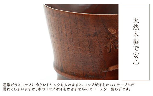 通常ガラスコップに冷たい飲み物を入れますと、コップが汗をかいてテーブルが濡れてしまいますが、 木のコップは汗をかきませんのでコースター要らずです。