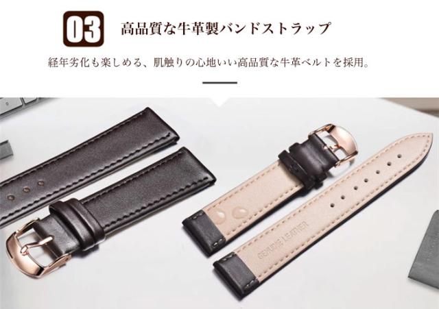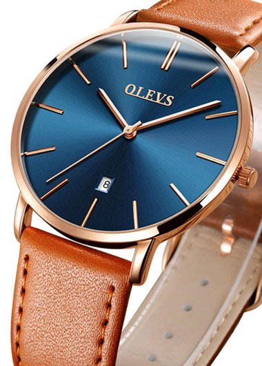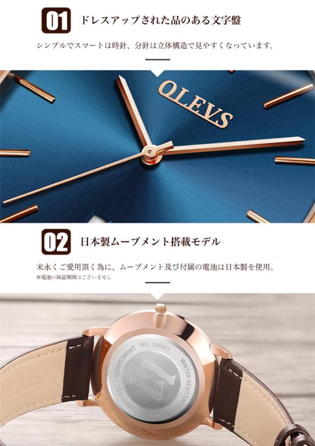 ![]() | シンプルなデザインでドレスアップされたOLEVSデザイン腕時計 フォーマルなデザインと品質の高い素材が魅力のファッションウォッチ「OLEVS」 フェイス幅38mmに厚みが6.5mmの超薄型ケースは、シンプルなデザインながら、品おあるこの存在感。 ベルトは牛革を採用しており、手首に優しくフィット。本革なので経年劣化も楽しめます。 またムーブメントは日本製ムーブメントを搭載し裏蓋やバックルはステンレススチールが使用されており、末永く愛用頂ける高品質なモデルです。 文字盤のカラーやベルトカラーの組み合わせも豊富で、9種類のバリエーションからお選びいただけます。 専用のボックスも付いているからギフトにもおススメです。