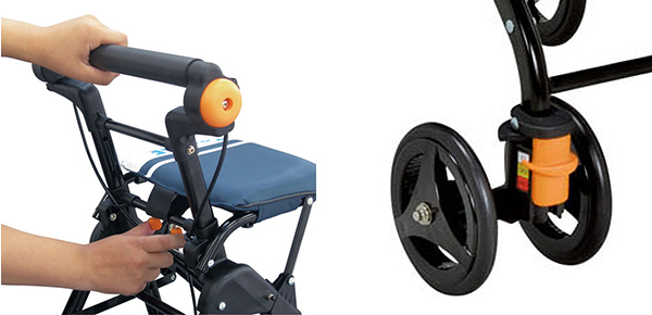 | 押し手高さ調節で幅広く対応 押し手の高さは、調節ツマミを内側に寄せるだけで、お好みの高さに簡単に調節できます。幅広く調節できるので、背の高い方から小柄な方まで負担なく使用できます。 | 場面で使い分けられるキャスター 前輪キャスターは、直進・90度・360度フリーの3段階に設定できます。買い物時の店舗内、砂利道など路面状態が悪い道、坂道など場面で使い分けることでスムーズに移動ができます。 |