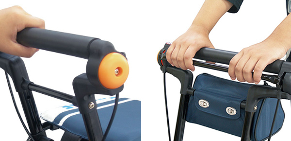 | ワンタッチ駐車ブレーキ 手元で駐車ブレーキを掛けることができます。押し手右側のオレンジのボタンを押すだけの簡単操作です。 | 左右連動の両手ブレーキ 連動式のブレーキなので、片手でブレーキレバーを握っても両方のタイヤにブレーキが掛かり安心です。 |