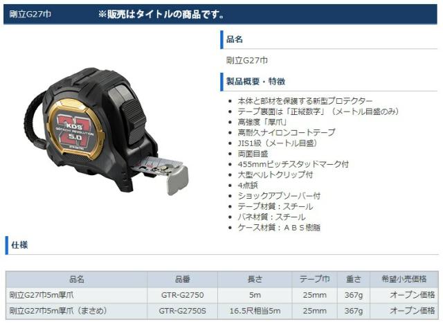 KDS 剛立G27巾5m厚爪 GTR-G2750 両面目盛 JIS1級 メートル目盛 厚爪・プロテクター加工 5m テープ巾27mm 製品重量367g 171094 。