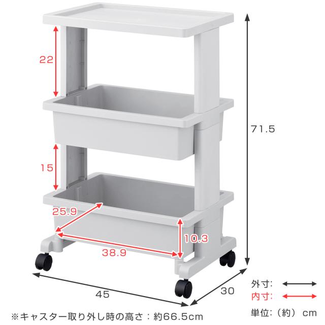 | サイズ | 約 幅45×奥行30×高さ71.5(cm) キャスター取り外し時の高さ:約 66.5cm 収納カゴ:約 幅38.9×奥行25.9×高さ10.3(cm) |