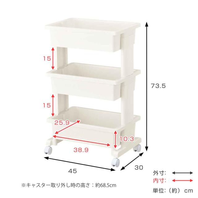 | サイズ | 約 幅45×奥行30×高さ73.5(cm) キャスター取り外し時の高さ:68.5cm |