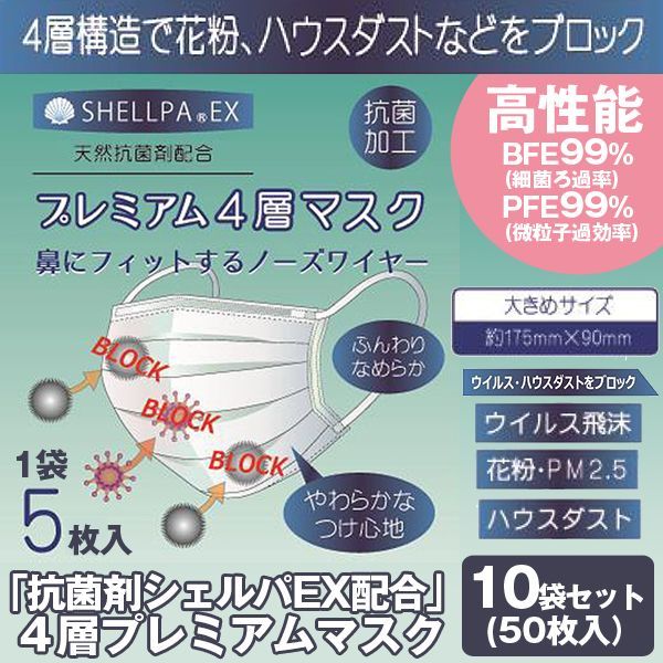 「抗菌剤シェルパEX配合」4層プレミアムマスク10袋セット(50枚入) (ウィルス対策 PFE99% BFE99% 花粉 飛沫感染対策 インフルエンザ 風邪 天然由来除菌成分配合)