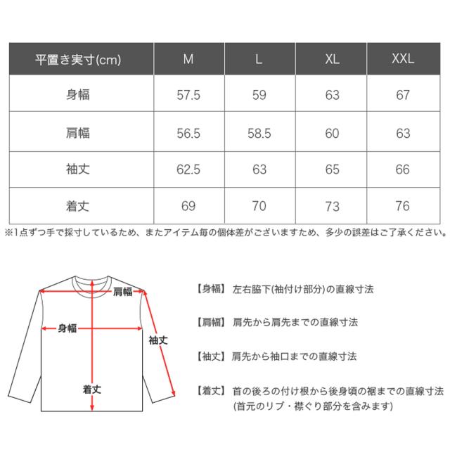 平置き実寸(cm)[身幅/肩幅/袖丈/着丈] Mサイズ 57.5/56.5/62.5/69・Lサイズ 59/58.5/63/70・XLサイズ 63/60/65/73・XXLサイズ 67/63/66/76 ※多少の誤差はご了承ください