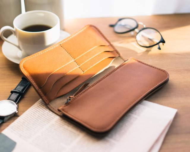 すべて本革で作られたスリムな長財布は、