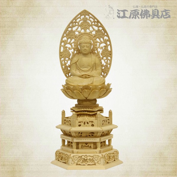 仏像 天台宗 ご本尊様 座弥陀(唐草光背)3寸 白木 六角台 家具調仏具 モダン仏具