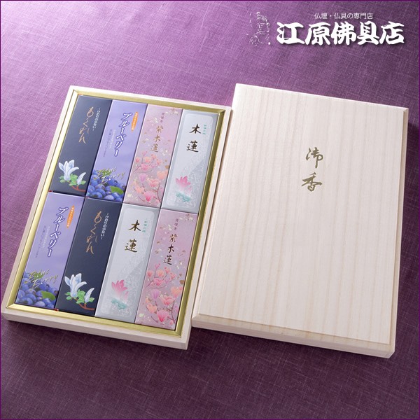 進物線香 慶賀堂 もくれん・ブルーベリーアソート(桐箱)4種類(8箱入)