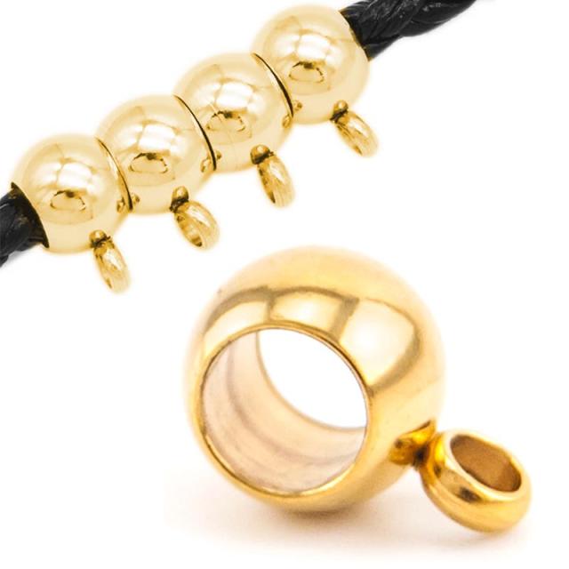 金色にメッキした3ミリ用、3.5ミリ用、4ミリ用、5ミリ用の皮ひもや丸ひもを通せるステンレス製のパーツに丸カンをつなげたチャームパーツを着けるためのDIY用パーツ。皮紐や丸紐でできたブレスレットやネックレス、アンクレットに通してマルカン部分にチャームを着ければすぐにトップやチャームが付けれるステンレス製のパーツです。ネックレスだけでなくボディピアスに通せばピアスをチャームにできるハンドメイドパーツ。自分だけのアクセサリーを作れるステンレスパーツです。素材も安心のステンレス。