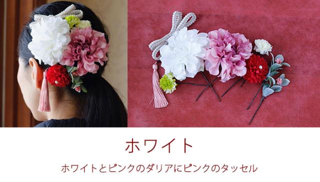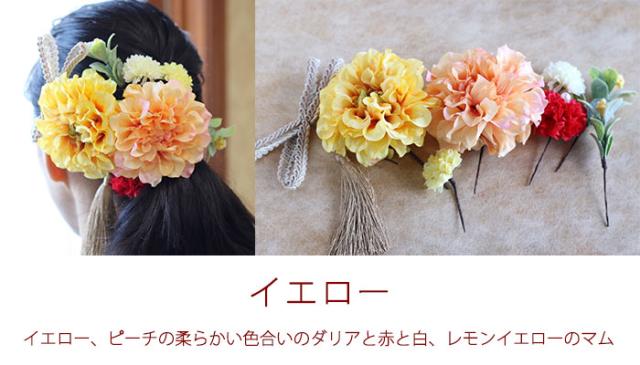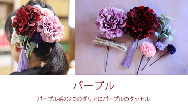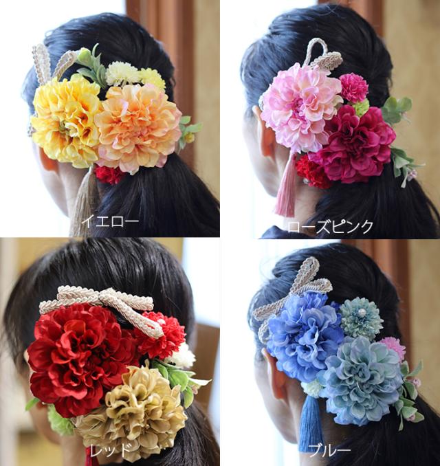 大輪のダリア2輪と大小の小花タッセルのついたヘアーパーツ。ヘアースタイルに合わせて形や配置も思いのままです。