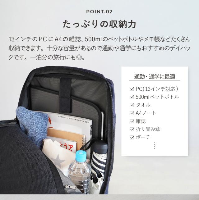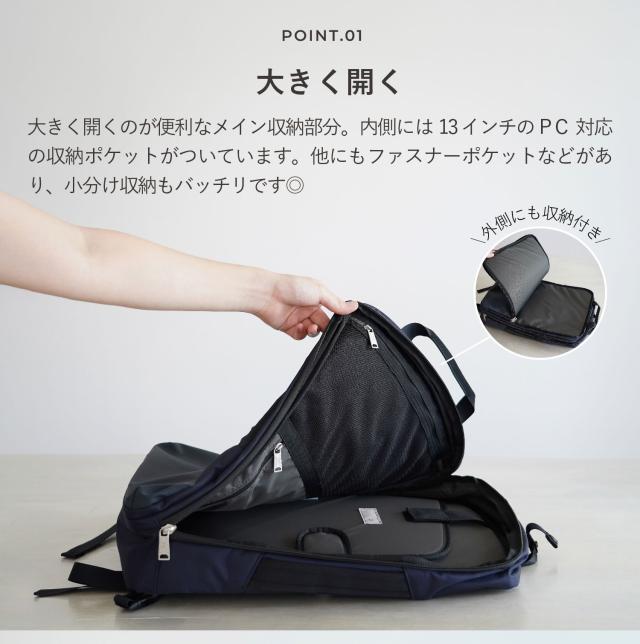 内側:PC収納ポケット(13インチ対応)×1 メッシュポケット×1 ファスナーポケット×1