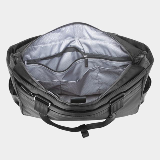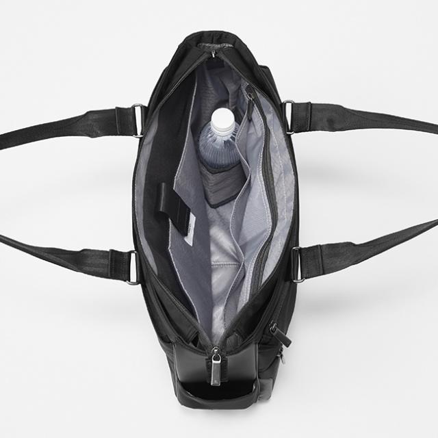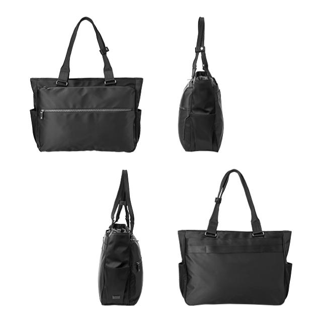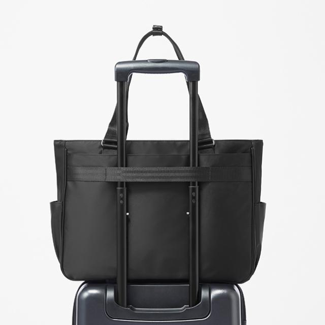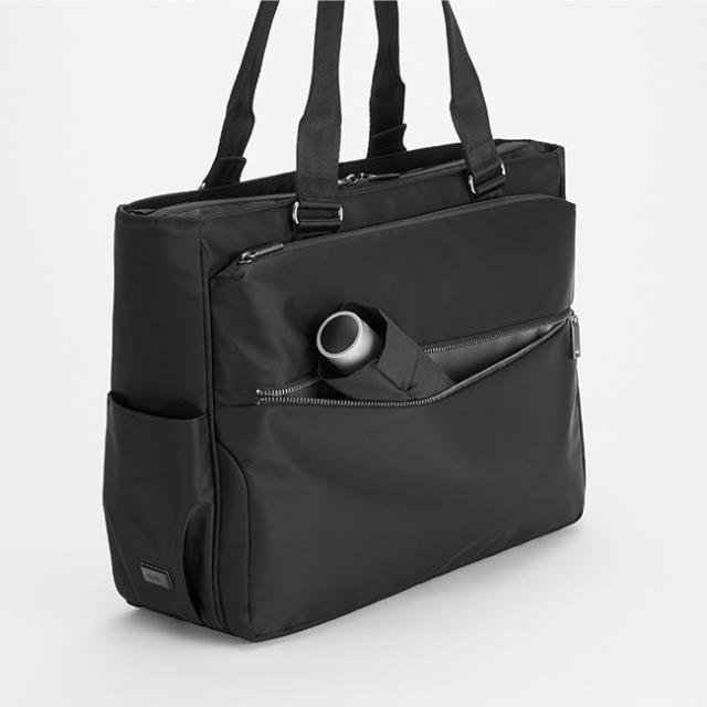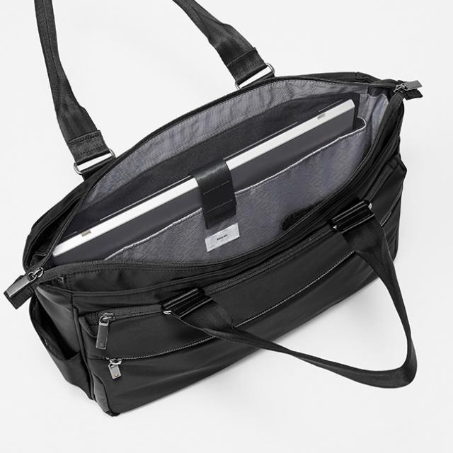| 出張、通勤やタウンユースなどオンオフ兼用できるB4サイズ対応のヨコ型トートバッグです。光沢感のあるナイロンに撥水加工を施した素材を使用。生地の光沢が高級感のある印象を与えます。フロントには大きめに配置されたファスナーポケットを上下段に設置。背面にもファスナーポケットがあり、書類の仕分けに便利。メイン内に15インチサイズのノートPCが収納可能。収納部の内側には吸水速乾メッシュを採用したボトルポケット付き。スーツケースにキャリーオンができ、旅行や出張のお供にも。 |