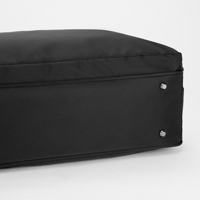 | トローリーバッグのプルドライブハンドルに固定し、走行時のバッグのふらつきを防ぎます。 | 底鋲付きで底面に汚れや傷が付くのを軽減。しっかり自立します。 |