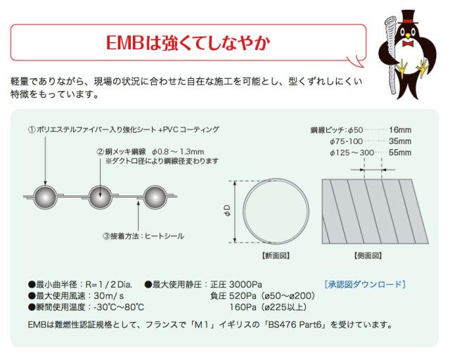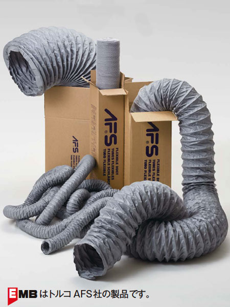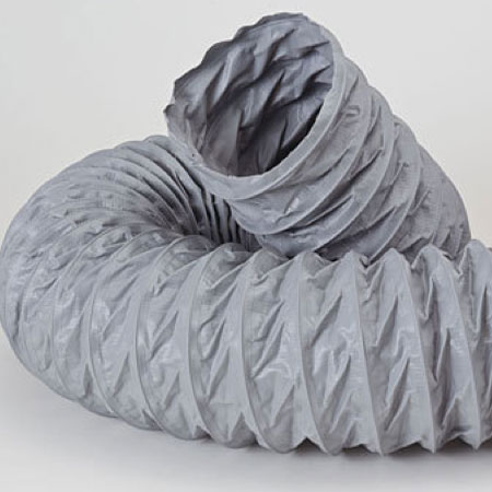 ポリエステルファイバー入り強化シート+PVC両面コートによる構造で、高耐久性を誇る塩ビフレキシブルダクト。