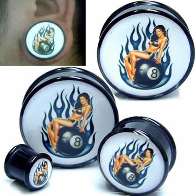 [アクリル プラグ ボディピアス ] グラフィックガールフィーバープラグ 1個販売 ボディピアス 金属アレルギー対応 メンズ レディース ダブルフレア プラスティック プラスチック 樹脂 黒色 ブラック 刺青 タトゥ 8ボール エイトボール レースクイーン 炎 火 ファイヤー