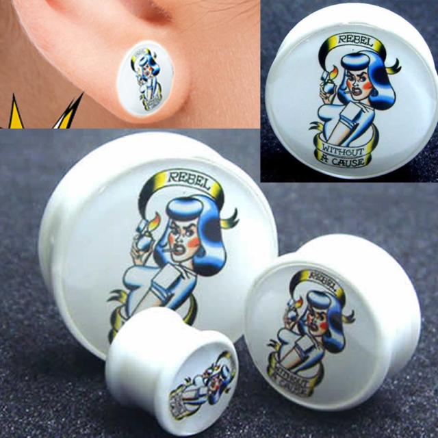 『REBEL WHITOUT A CAUSE』(理由なき反抗)と書かれたユニークなデザインのアクリルボディーピアスです。白のプラグに色鮮やかにデザインされたタバコを吸う女性が意味するものとは?!メッセージ性の強いデザインのボディピアスは、無言のアピール!