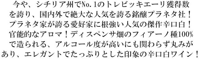 "今や、シチリア州でNo.1のトレビッキエーリ獲得数を誇り、国内外で絶大な人気を誇る銘醸プラネタ社!プラネタ家が誇る愛好家に根強い人気の傑作辛口白!官能的なアロマ!ディスペンサ畑のフィアーノ種100%で造られる、アルコール度が高いにも関わらず丸みがあり、エレガントでたっぷりとした印象の辛口白ワイン!
