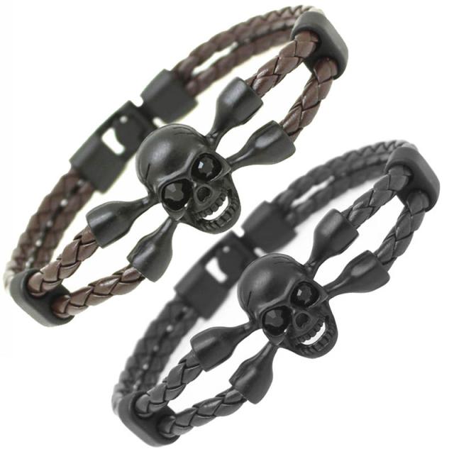 黒色と茶色の編込みの革製のロープブレスレット2本のトップに艶消し加工したマットな黒いドクロの眼に黒いキュービックジルコニアを嵌め込んだ不気味なレザーブレスレット。