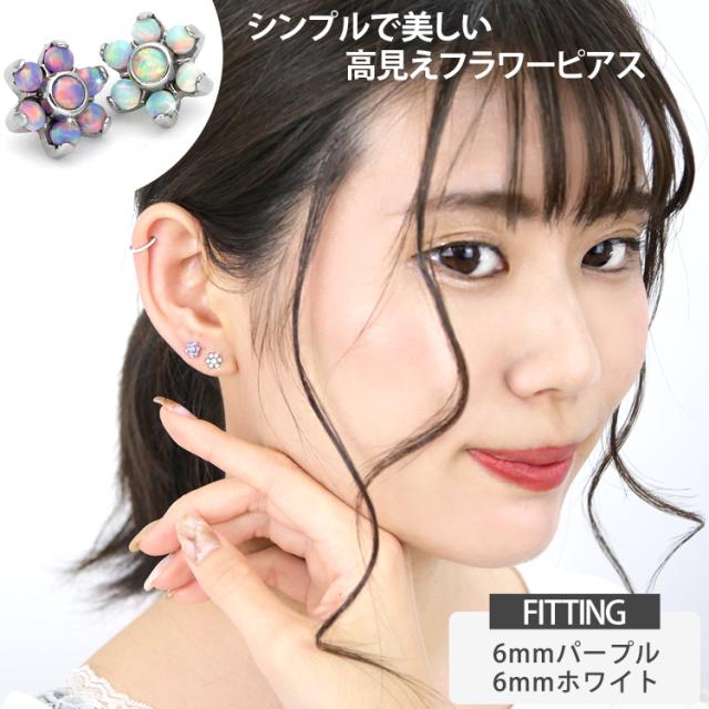 遊色が美しい人工オパールが目を惹く、可憐なお花モチーフのラブレットピアス。 上品なプチデザインが大人かわいい高見えアイテムです。 裏側はフラットで、着けたまま寝ても痛くならず、つけっぱなしでも快適にお使いいただけます。 ネジはモチーフに厚みが出ないインターナル(逆ねじ)タイプなので、横から見た時にすっきり見えます。 カラーはパープル、ホワイト、ピンク、ブルーの全4色。 素材はアレルギーが起きにくいALLサージカル(医療用)ステンレス素材なので、金属アレルギーの方やファーストピアスとしても安心です。