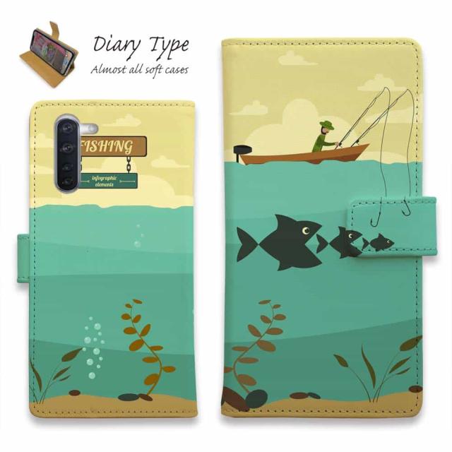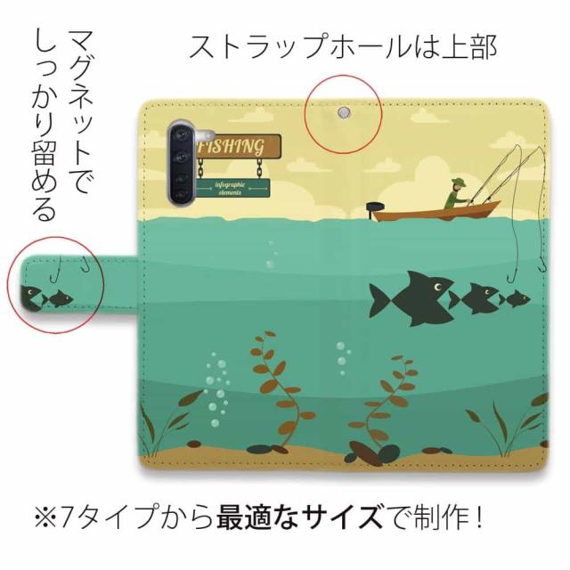 Android スマホケース 手帳型 マグネット カード収納 OPPO Reno5 A OPPO Reno3 A Android One S8 ケース シンプルスマホ6 らくらくスマートフォン LG V60 ThinQ xiaomi mi URBANO アンドロイド ケース 釣り 魚 ルアー Fishing on the boat イラスト